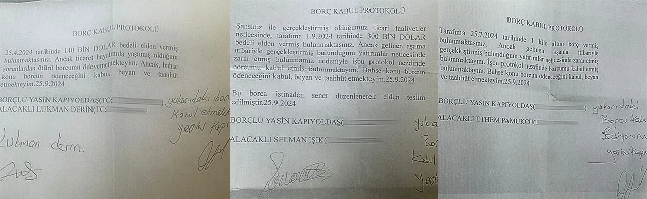 Bu kişilerin yanı sıra İsmail Alp, Alp’in oğlu ve yeğeni ile Süleyman Zamur da, Yasin Kapıyoldaş’a yüklü miktarda para ve altın verdi. Evraklara göre İsmail Alp, 21 kilo altın, 3 milyon 836 bin dolar verdi. İsmail Alp’in oğlu ve yeğeni ise 275 kilo gümüş, 162 bin dolar verdi. Süleyman Zamur ise 1 kilo 317 gram altın verdi. Kapıyoldaş hakkında suç duyurusunda bulunan bu kişiler bir süre sonra sulh protokolü imzaladı. Kapıyoldaş, aldığı varlıklara karşılık gayrimenkul ve araç devri yaptı. Ancak yapılan hesaplamalara göre, söz konusu kişiler halen daha en az 2.5 milyon dolar alacaklı.