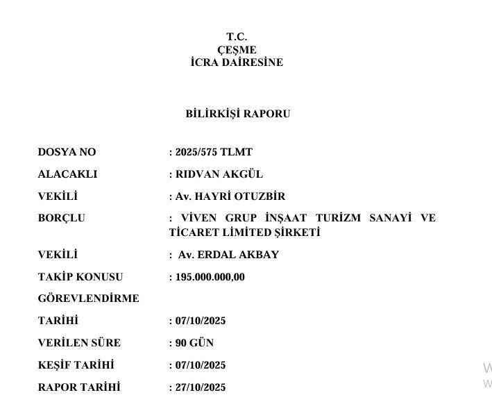MedyaRadar'dan Ercan Öztürk'ün haberine göre, 2022 yılında altı işçinin ölümüyle adını duyuran Viven İnşaat şimdi de icralarla gündemde. İzmir'in en yüksek projelerinden Viven Tower'ı hayata geçiren şirketin ortakları ise Emrullah Yolçi ile eski futbolculardan Alim Emiroğlu. Çeşme İcra Dairesi, Rıdvan Akgül'ün 190 milyonluk alacağından dolayı Viven İnşaat'ın Çeşme'de üzerinde kaba inşaatın bulunduğu arsayı satışa çıkardı. Natamam inşaatın satış bedeli ise 294 milyon TL olarak belirlendi.