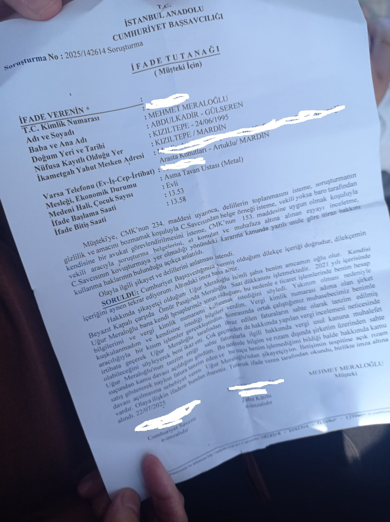 Mardinli asma tavan ustası Mehmet Meraloğlu, 2021’de amcasının oğlu Uğur Meraloğlu’nun “e-ticaret hesaplarında sorun yaşadığını” söylemesi üzerine vergi kimlik numarasını ve şirket bilgilerini verdiğini, ancak bunun kötüye kullanıldığını savundu. Mehmet Meraloğlu, “Faturaların sahte olduğunu muhasebecimden öğrendim. Durumu fark ettiğimde çok geçti, kamu davası açılmıştı” dedi.
