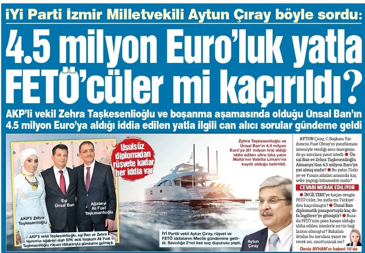 Zehra Taşkesenlioğlu ve o dönemki eşi Ünsal Ban’ın mal varlığı günlerce manşetlerden düşmedi. Zehra hanım, 4.5 milyon Euro değerindeki lüks yatı için, “Tesettürlü olduğunu, denize girmek için mahremiyete ihtiyaç duyduğunu” belirtmişti. Serveti için de, “Allah kimisini yoklukla kimisini varlıkla imtihan eder. Beni varlıkla imtihan ediyor” demişti.