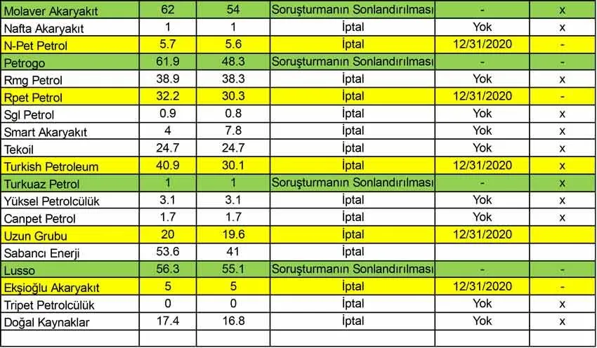 Dolayısıyla vurgun süreci hız kesmeden devam etmiş oluyor. EPDK’nın yayınladığı ve lisansları iptal edilen şirketleri ise şöyle; Ana Akaryakıt, Lion Petrol, As Goldoil, Aslanlar İthalat, Aston Petrolleri, Asyaoil Akaryakıt, BHS Akaryakıt, Enko Petrolcülük, Epet Grup, Gama Pet, Garajoil Akaryakıt, Gazmer Petrol, Hema Akaryakıt, Kalegaz Petrol, Kent Oil, Lepet Akaryakıt, Life Petrolcülük, Lik Akaryakıt, Lig Oil, Link Kimya, Lükss Akaryakıt, MAS Petrolcülük, Mavi Gök-Deniz, MFD Akaryakıt, Molaver Akaryakıt, Nafta Akaryakıt, N-Pet Petrol, Petrogo, RMG Petrol, Rpet Petrol, SGL Petrol, Smart Akaryakıt, Tekoil, Turkish Petroleum, Finans Petrol, Yüksel Petrolcülük, Canpet Petrol, Uzun Grubu, Sabancı Enerji, Lusso, Tripet Petrolcülük, Doğal Kaynaklar.