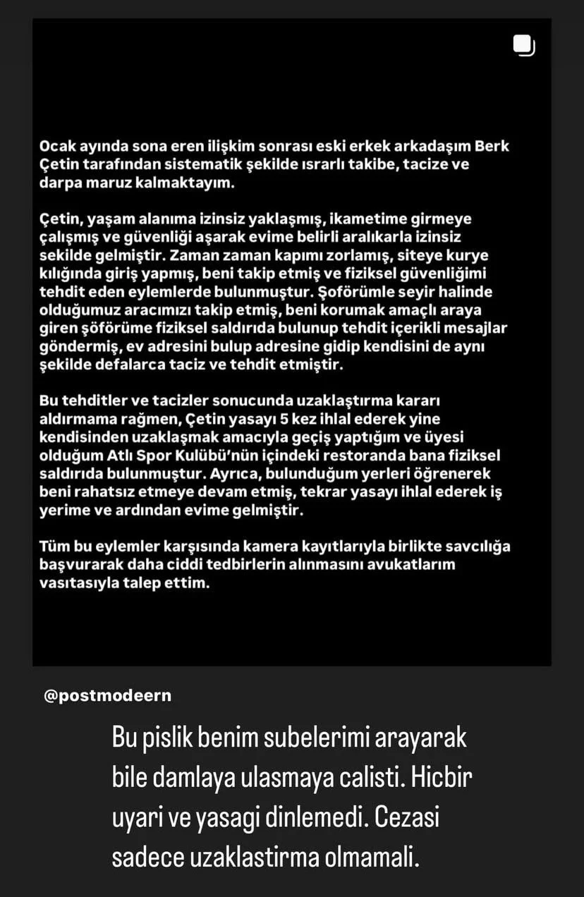 Bilic’in açıklamaları kısa sürede sosyal medyada geniş yankı bulurken, konuya ilişkin bir destek mesajı da sosyal medya fenomeni Ala Tokel’den geldi. Tokel, yaptığı paylaşımda Berk Çetin’in kendisine de ulaşmaya çalışarak Bilic’e yakınlık kurmak istediğini iddia etti.