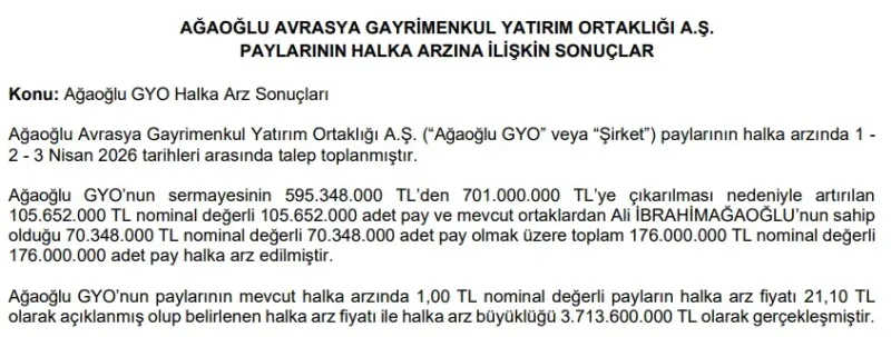 Ağaoğlu Avrasya Gayrimenkul Yatırım Ortaklığı A.Ş.’nin (Ağaoğlu GYO) halka arzı tamamlandı. Kamuyu Aydınlatma Platformu (KAP)’a yapılan açıklamaya göre, 1-3 Nisan 2026 tarihleri arasında gerçekleştirilen halka arzda toplam 176 milyon adet pay satıldı ve 3 milyar 713 milyon 600 bin TL gelir elde edildi.