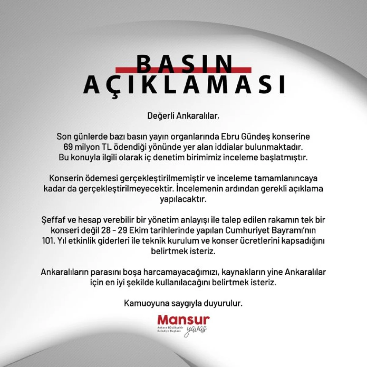 Ankara Büyükşehir Belediyesi'nin X hesabından Mansur Yavaş imzasıyla yapılan açıklamada, "Son günlerde bazı basın yayın organlarında Ebru Gündem konserine 69 milyon TL ödendiği yönünde yer alan iddialar bulunmaktadır. Bu konuyla ilgili olarak iç denetim birimimiz inceleme başlatmıştır. Konserin ödemesi gerçekleştirilmemiştir ve inceleme tamamlanıncaya kadar da gerçekleştirilmeyecektir. İncelemenin ardından gerekli açıklama yapılacaktır. Şeffaf ve hesap verebilir bir yönetim anlayışı ile talep edilen rakamın tek bir konseri değil 28-29 Ekim tarihlerinde yapılan Cumhuriyet Bayramı'nın 100. Yıl etkinlik giderleri ile teknik kurulum ve konser ücretlerini kapsadığını belirtmek isteriz. Ankaralıların parasını boşa harcamayacağımızı, kaynakların yine Ankaralılar için en iyi şekilde kullanılacağını belirtmek isteriz" denildi.