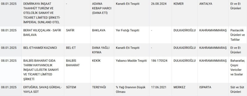 8 Ocak tarihli listede son olarak Garanti Baharat'ın kırmızı toz biber ürününde domates tespit edildiği bilgisi yer aldı.