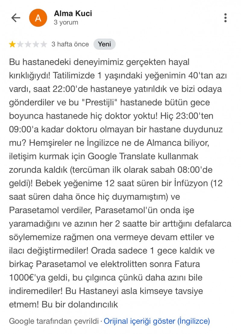 Google ve çeşitli platformlarda yer alan bazı yorumlarda, hastaneye gönderilen turistlerin kendi deneyimlerini anlattığı görülüyor. Bazı turistler “hafif bir rahatsızlık nedeniyle 5 gün yatırıldığını, çıkmak istemelerine rağmen izin verilmediğini, ayrıldıktan sonra sigorta şirketlerinden yüksek meblağlar talep edildiğini” ifade ediyor.