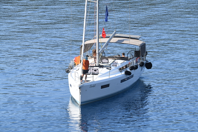 Deniz sefasının ardından tekneye dönen Ata Demirer, "Ebru" diye seslenerek Alkanat'ı suya davet etti. "Seni uyandırmaya kıyamadım, ben 1 saattir yüzüyorum" diyen Demirer'in çağrısına karşılık veren Ebru Alkanat, kendisini serin sulara bıraktı.