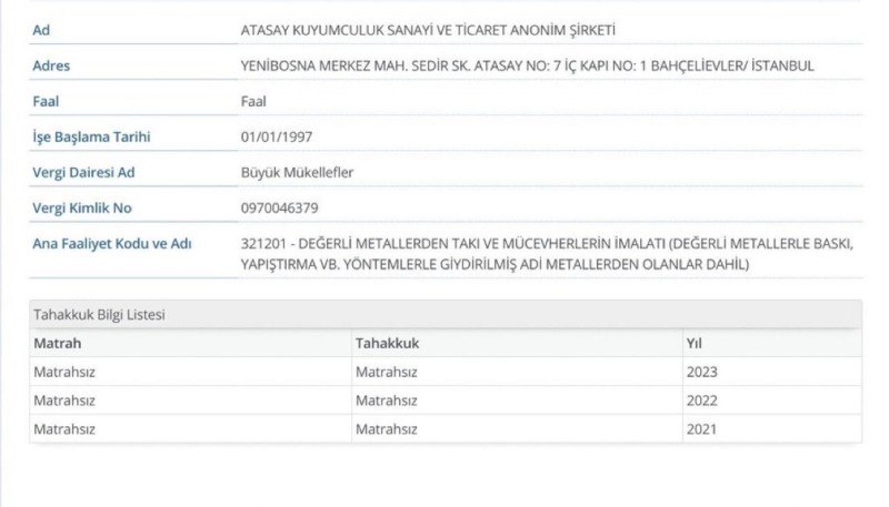 X’te bir Etkili Haber isimli bir hesap, “Türkiye’nin en büyük kuyumculuk şirketlerinden ATASAY’ın son 3 yıldır vergi ödemediği ortaya çıktı.” paylaşımını yaparak Atasay’a ait olduğu iddia edilen bir belgenin ekran görüntüsünü paylaştı.