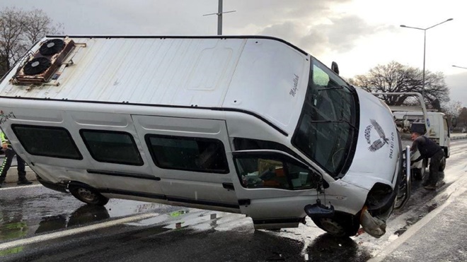 Kaza sonucu servis minibüsü devrildi. Çevredekilerin ihbarı üzerine olay yerine sağlık ve polis ekipleri sevk edildi.
