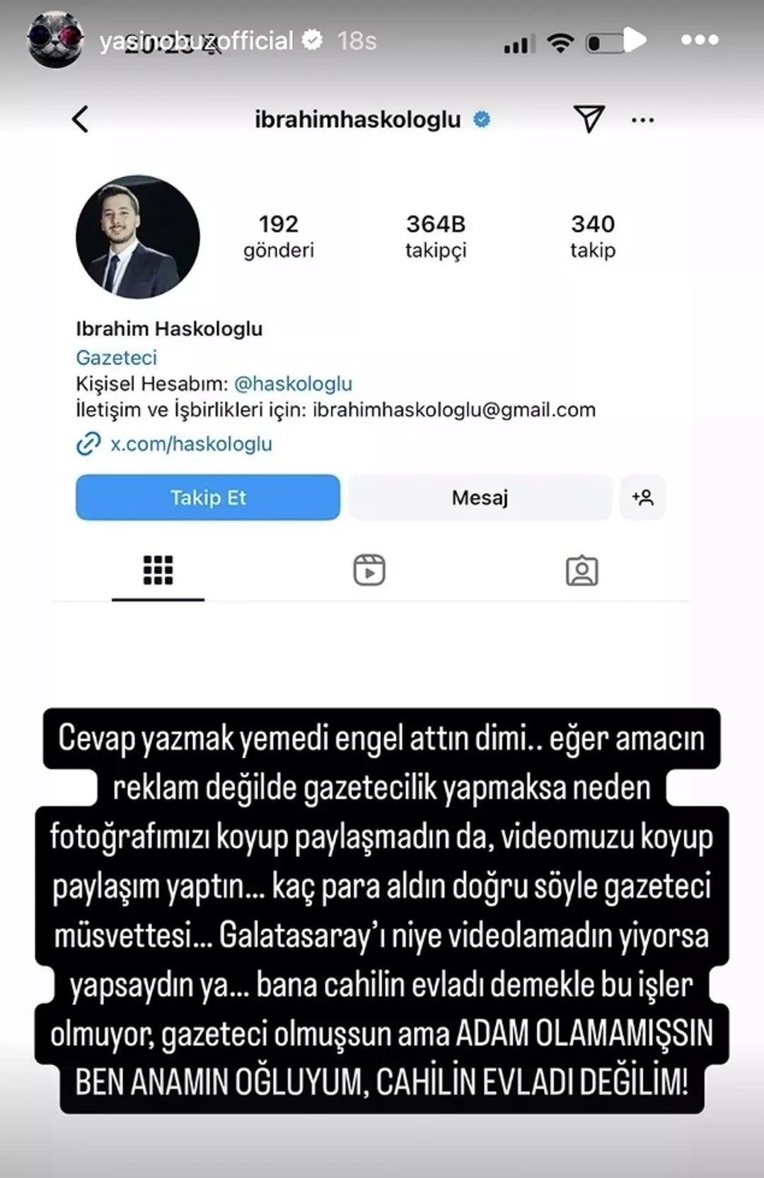 İbrahim Haskoloğlu da Yasin Obuz'un bu paylaşımlarının ardından sosyal medya hesabında açıklama yaptı. "Yasadışı bahis siteleriyle çalıştığını ifşa ettiğim bir şahıs bana hakaret edip, hedef gösteriyor. Hayatındaki en büyük başarısı saçma sapan yarışmalarda varoşluk yaparak takipçi kazanmak olan bu tipler, gençleri zehirliyor. 'de - da' eklerinden bile haberleri yok. Umarım Yenidoğan çetesini çökerten yürekli bir savcı çıkar ve devletle alay eden bu piyonları, sahiplerini çökertir. En azından bu şahısların hesaplarını Türkiye'ye erişimini kapattırın. Ülkenin halini eleştirenleri engellemek yerine bunları engelleyin." dedi.