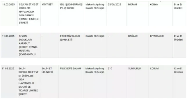 Tarım Ve Orman Bakanlığı, 81 ilde yapılan denetimler sonucunda mevzuata aykırı üretim gerçekleştirdiği tespit edilen gıda firmalarını ifşa etmeye devam ediyor. Bakanlığın internet sitesinde yer alan 'Taklit veya Tağşiş Yapılan Gıdalar' listesinde güncellemeye gidilirken, son eklenen firmalar arasında çok sayıda sucuk üreticisi yer aldı.