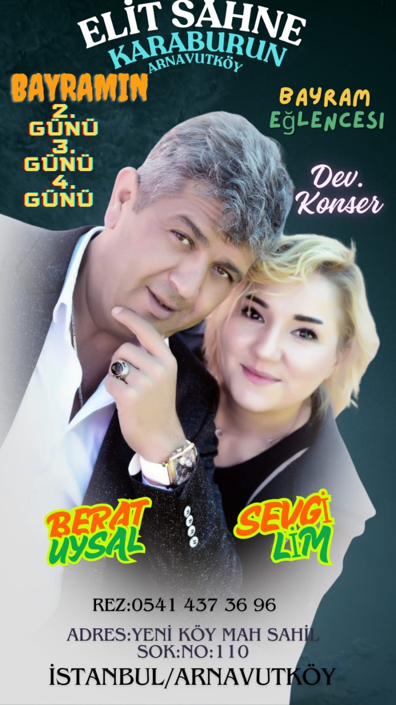 Bayram geceleri bu yıl da müzikle taçlanıyor! Türk halk müziğinin güçlü sesi Berat Uysal ile sahnelerin zarif ve etkileyici ismi Sevgi Lim, bayramın 2. günü, ışıltılı bir organizasyonla Arnavutköy Karaburun’daki Elit Sahne'de unutulmaz bir konser verecek.