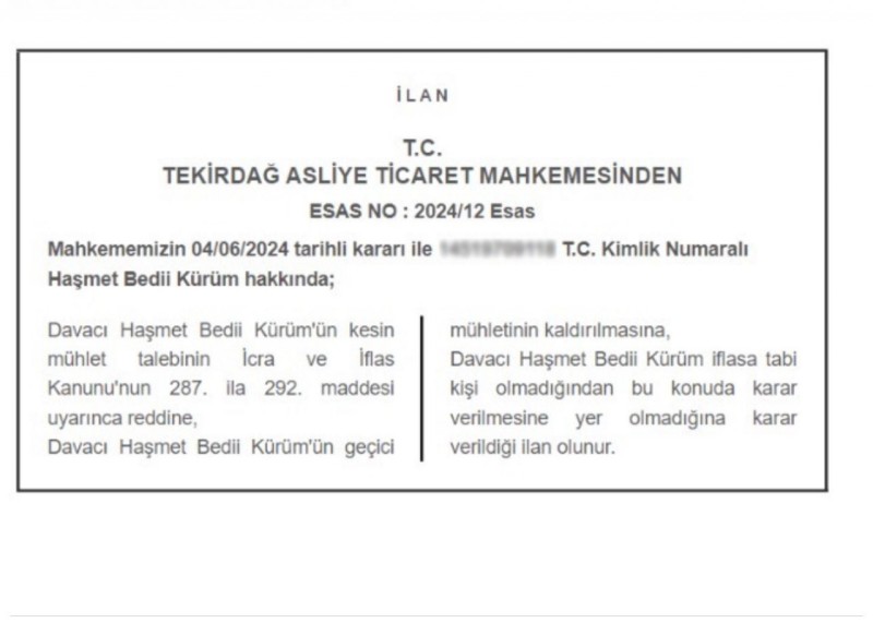 En büyük 500 sanayi şirketi listesinde yer alan Kürüm Demir'in kurucusu Beşiktaş'ın eski yöneticilerinden olan Haşmet Bedii Kürüm, Tekirdağ Asliye Ticaret Mahkemesi’nden 19 Mart’ta 3 ay süreyle geçici mühlet aldı. Mahkeme kararında, ‘’Konkordatonun başarıya ulaşmasının mümkün olup olmadığının incelenmesi, başka bir deyişle davacının mali durumunun düzelmesinin mümkün olup olmadığı veya konkordato teklifinin tasdik şartlarının yerine gelip gelemeyeceğinin tespiti amacıyla alacaklı sayısı ve alacak miktarı dikkate alınarak mahkememizce resen seçilen Özkan Yılmaz (Bağımsız Denetçi), Aslı Güvenilir (Serbest Muhasebeci), Koray Çevik (avukat)’in geçici komiser olarak atanmasına karar verilmiştir’’ denildi. Geçici Komiser olarak atanan uzmanların yaptıkları incelemeden sonra 4 Haziran 2024 tarihinde yapılan duruşmada ‘’Geçici mühlet’ kararı kaldırıldı. Alınan kararda şu ifadelere yer verildi; ‘’Davacı Haşmet Bedii Kürüm‘ün kesin mühlet talebinin İcra ve İflas Kanunu'nun 287. ila 292. maddesi uyarınca reddine, Davacı Haşmet Bedii Kürüm‘ün geçici mühletinin kaldırılmasına, Davacı Haşmet Bedii Kürüm iflasa tabi kişi olmadığından bu konuda karar verilmesine yer olmadığına karar verildiği ilan olunur.’’