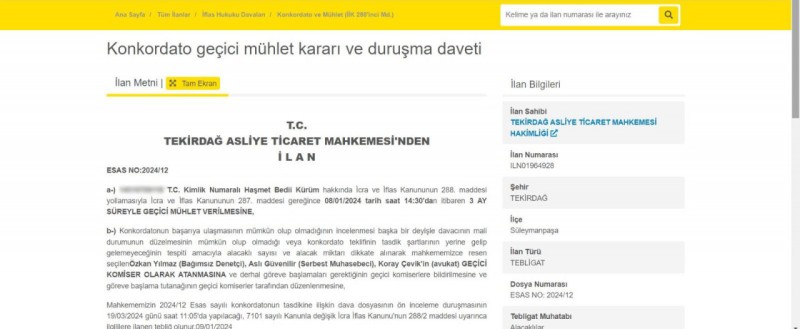 2020 yılında hileli yollarla Türkiye’de 14, yurtdışında 19 bankayı 1.5 milyar TL (faiz hariç) dolandırdığı iddiasıyla gündeme gelen Haşmet Bedii Kürüm’e mahkemeden kötü haber. ‘’Borçlarımı gününde ödeyemeyeceğim’’ diyerek 2024 yılının başında Tekirdağ Asliye Ticaret Mahkemesi’ne konkordato başvurusu yaptı. 19 Mart 2024 tarihinde üç ay süreyle ‘Geçici mühlet’’ kararı aldı. Ancak 4 Haziran 2024 tarihinde yapılan duruşmada mahkeme daha önce verdiği ‘Geçici mühlet’’ kararını kaldırdı.