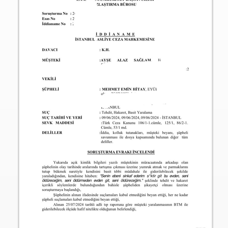 Savcılık, iddianamede yeterli deliller olduğuna kanaat getirirken, iddianamede Emin Hitay’ın fazlasıyla belden aşağı küfürlerine de yer verdi. İddianamede yer alan "Senin ebeni sinkaf ederim s.ktir git bu evden, seni öldüreceğim, seni öldürmeden evden git, seni öldüreceğim" beyanı yer aldı.