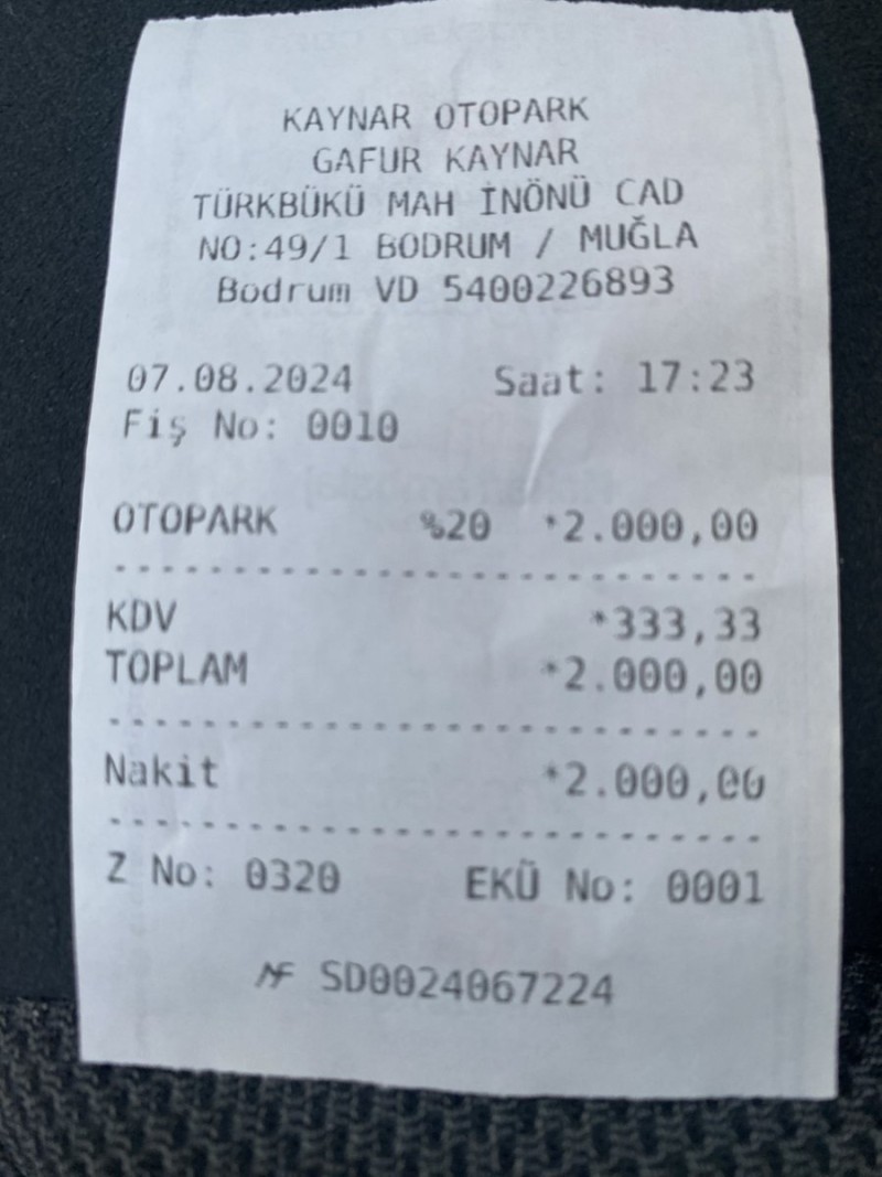 Bodrum'da iki günlük tarla otoparkına ödenen fişi paylaşan Eski Turizm Bakanı Bahattin Yücel fahiş fiyatlara bir kez daha dikkat çekti. Verilen fişe göre Bodrum Gölköy'de tarla otoparkına 2 gecelik 2000 TL ödeme yapıldı.