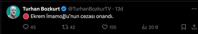 Odatv'nin bir çok kez dikkat çektiği FETÖ'nün kripto ekonomi imamı Turhan Bozkurt uydurma bir tweet attı: Ekrem İmamoğlu'nun cezası onandı.