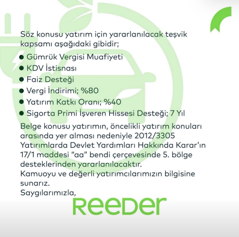 Reeder şirketi tarafından KAP’a gönderilen heberde 3 yıl sürecek 1 milyar TL’lik yatırım karşılığında alınan müthiş teşvik açıkladı. Söz konusu açıklamada şirkete gümrük vergisi muafiyeti, KDV istisnası, yüzde 80 vergi indirimi, yüzde 40 yatırım katkı oranı ve sigorta teşvik hissesi desteği 7 yıl olarak olarak belirtildi.