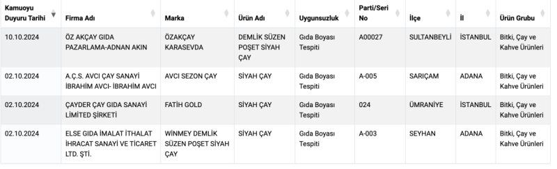 Bakanlığın farklı tarihlerde güncellediği listede çeşitli çay markalarının da gıda boyası kullandığı belirtiliyor.