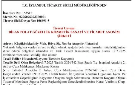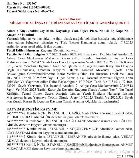 Ticaret Sicil Gazetesi’nde 16 Temmuz 2025 tarihinde yayınlanan ilanda, ‘’Fon kurulunun 10 Temmuz 2025 tarihli 2025/430 sayılı kararıyla yönetim kurulunun fon tarafından oluşturulmasının sonlandırılmasına, bu şirkete fon kurulunun muhtelif kararlarıyla atanan Yönetim Kurulu Başkanı, Yönetim Kurulu Başkan Vekili ve üyelerinin bu görevlerinin sonlandırılmasına karar verilmiştir’’ ifadelerine yer verildi. İlanda, şirket yönetiminde bulunan isimlerle ilgili alınan kararlar ise şöyle anlatıldı,’’ Daha önceden Yönetim Kurulu Başkanı olarak görev yapan Halil İbrahim Akyıldız’ın bu görevi sona ermiştir. Daha önce Yönetim Kurulu Başkan Vekili olarak görev yapan Mehmet Nihat Arcagök’ün bu görevi sona ermiştir. Daha önceden şirketlerde temsile yetkili görevi olan İcat Saydam, Bülent Girgin, Ahmet Miraç Akmen, Vedat Akman, Kenan Akcan’ın bu görevleri sona erdi’’