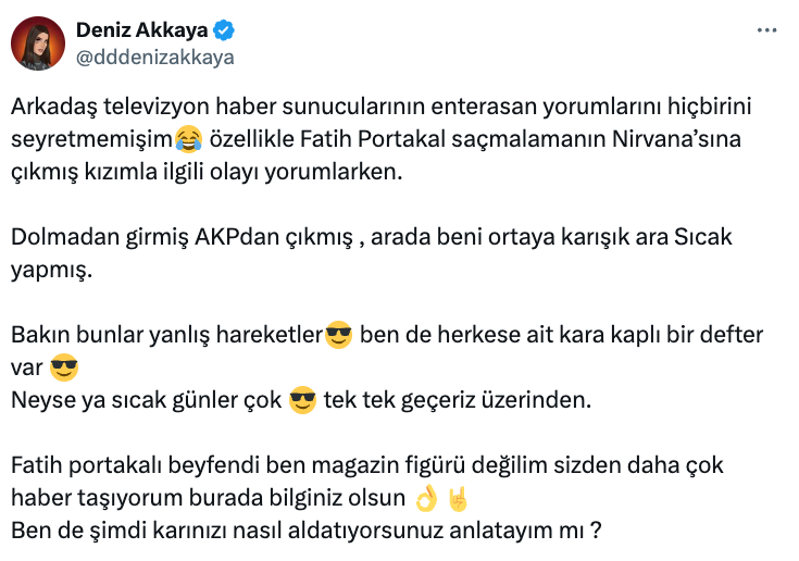 Kızıyla yaşadığı polemikle gündemden düşmeyen Deniz Akkaya, Fatih Portakal hakkında çarpıcı iddialarda bulundu. “Arkadaş televizyon haber sunucularının enterasan yorumlarını hiçbirini seyretmemişim. Özellikle Fatih Portakal saçmalamanın Nirvana’sına çıkmış kızımla ilgili olayı yorumlarken” ifadelerini kullanan Deniz Akkaya, devamında ‘aldatma’ iddiasında bulundu.