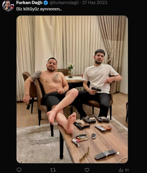 Furkan Dağlı'nın geçtiğimiz yıl Haziran ayında arkadaşlarıyla eli silahlı poz verip, ‘Biz kötüyüz aynen’ notuyla paylaşım yaptığı da ortaya çıktı.
