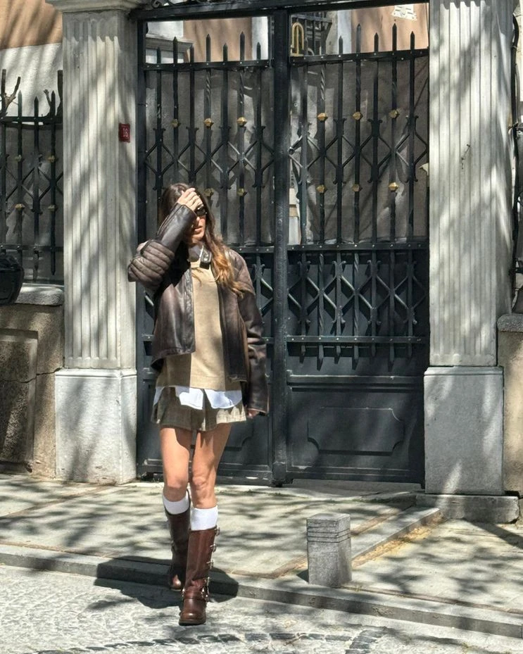 Deniz, mini eteğini kahverengi deri bir ceket, bot ve bej rengi bir kazakla kombinledi.