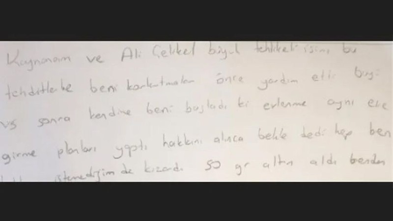 Araçta bulunan intihar mektubunda çok korktuğunu dile getiren kadın, "Beni bu duruma düşüren Ali Ç. büyük tehlikeli. Beni kendine bağladı, aynı eve girme planları yaptı. Sonra oyalamaya başladı. Tehditler edip, geceleri beni korkutarak paramı aldı. Konya'ya yanına gittim, silah çıkardı. Zor çıktım, beni öldürecekti. Hep bir oyun içindeymişim. Bana ne kötülük varsa yapacağını söyledi. Artık yaşamak istemiyorum. Hep uğraşacak. Ben artık dayanamıyorum" yazdı.