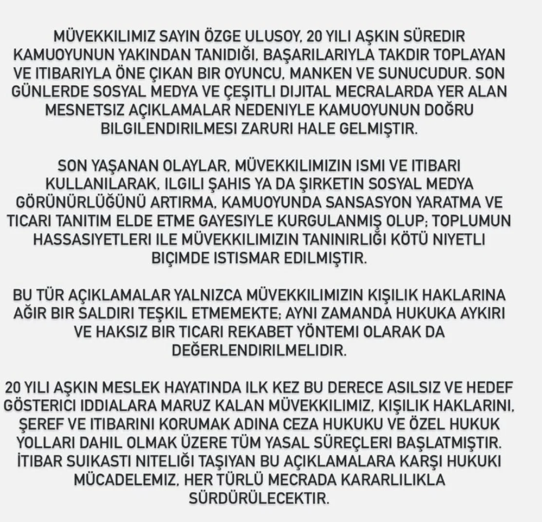 "Müvekkilimiz sayın Özge Ulusoy, 20 yılı aşkın süredir kamuoyunun yakından tanıdığı başarılarıyla takdir toplayan ve itibarıyla öne çıkan bir oyuncu, manken ve sunucudur. Son günlerde sosyal medya ve çeşitli dijital mecralarda yer alan mesnetsiz açıklamalar nedeniyle kamuoyunun doğru bilgilendirilmesi zaruri hale gelmiştir."