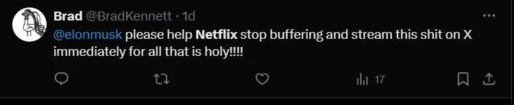 “Elon Musk lütfen Netflix'in ara belleğe almayı durdurmasına ve bu saçmalığı derhal X'te yayınlamasına yardım edin, tüm kutsallık adına!!!!”