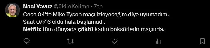Boks dünyasının merakla beklediği karşılaşma, efsanevi boksör Mike Tyson ile popüler YouTuber Jake Paul arasında gerçekleşecekti ancak 16 Kasım 04.00’da başlaması beklenen maç bir türlü başlamadı. Maçı öncesinden canlı yayınlayacağını duyuran Netflix’in bir türlü maçı yayınlayamaması tepki çekti.
