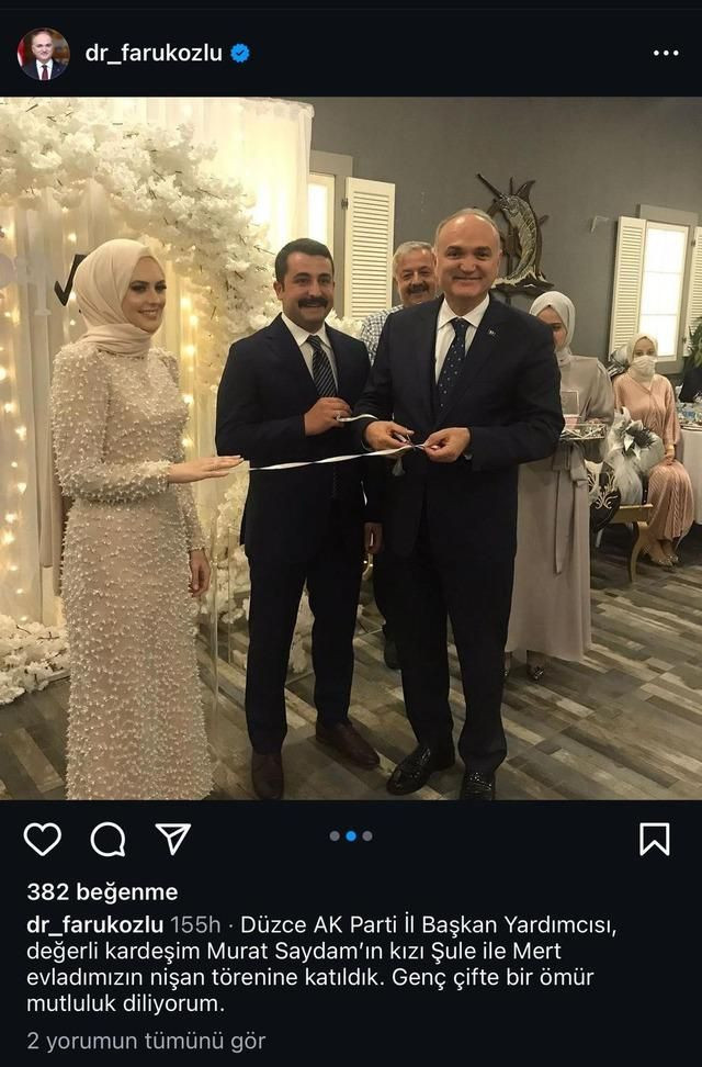 Öyle ki Düzce Belediye Başkanı Faruk Özlü'nün, Saydam'ın kızının nişan töreninde kurdeleyi kestiği görüntüler sosyal medyada yayıldı. Söz konusu nişan görüntülerini Başkan Özlü'nün "Düzce AK Parti il Başkan Yadımcısı değerli kardeşim Murat Saydam.'ın kızı Şule ile Mert evladımızın nişan törenine katıldık. Genç çifte bir ömür mutlululuk diliyorum" notuyla paylaştığı belirlendi.