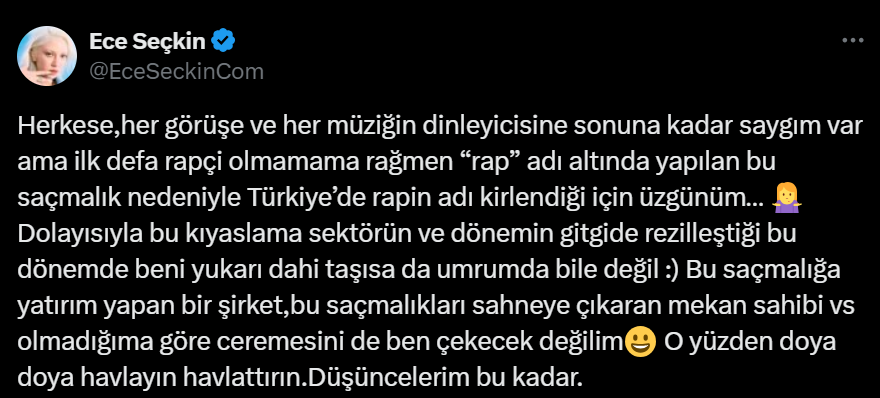 "Herkese, her görüşe ve her müziğin dinleyicisine sonuna kadar saygım var ama ilk defa rapçi olmamama rağmen “rap” adı altında yapılan bu saçmalık nedeniyle Türkiye’de rapin adı kirlendiği için üzgünüm… Dolayısıyla bu kıyaslama sektörün ve dönemin gitgide rezilleştiği bu dönemde beni yukarı dahi taşısa da umrumda bile değil. Bu saçmalığa yatırım yapan bir şirket, bu saçmalıkları sahneye çıkaran mekan sahibi vs olmadığıma göre ceremesini de ben çekecek değilim O yüzden doya doya havlayın havlattırın. Düşüncelerim bu kadar."