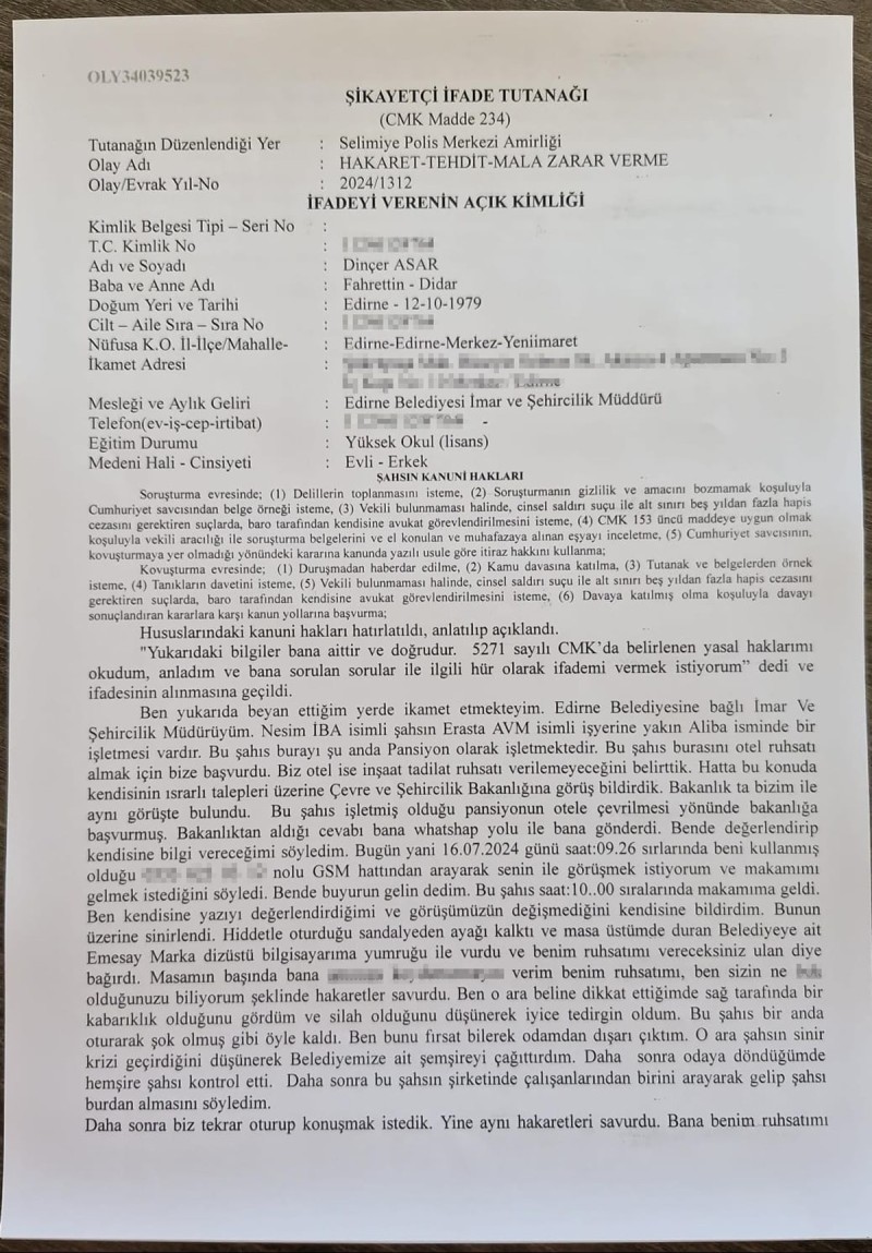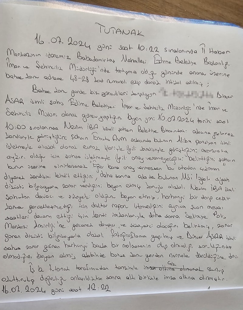 16 Temmuz 2024 Salı günü sabah 10.00 sıralarında Nesim İba, Edirne Belediyesi İmar Ve Şehircilik Müdür Vekili Dinçer Asar’ın odasına girdi. Sinir krizi geçiren İba "Eğer bana onay vermezsen bu odadan çıkmam” dedi. Odadaki bilgisayarlara zarar verip küfürler yağdıran İba, Dinçer Asar’ın emniyetteki ifadesine göre belindeki kabarıklığı sürekli göstererek silahlı tehdit imasında da bulundu.