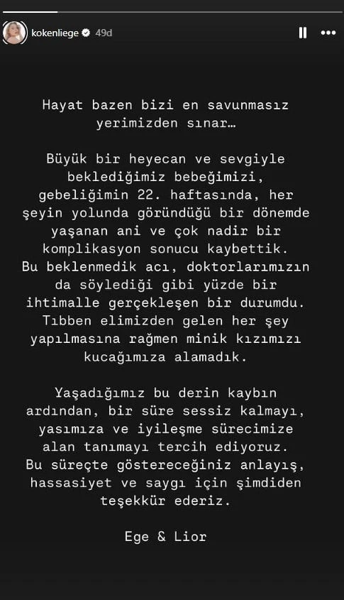 2022 yılında Lior Ahituv ile nikah masasına oturan 32 yaşındaki oyuncu Ege Kökenli, sosyal medya hesabından yaptığı paylaşımda 22 haftalık bebeğini kaybettiğini açıkladı.