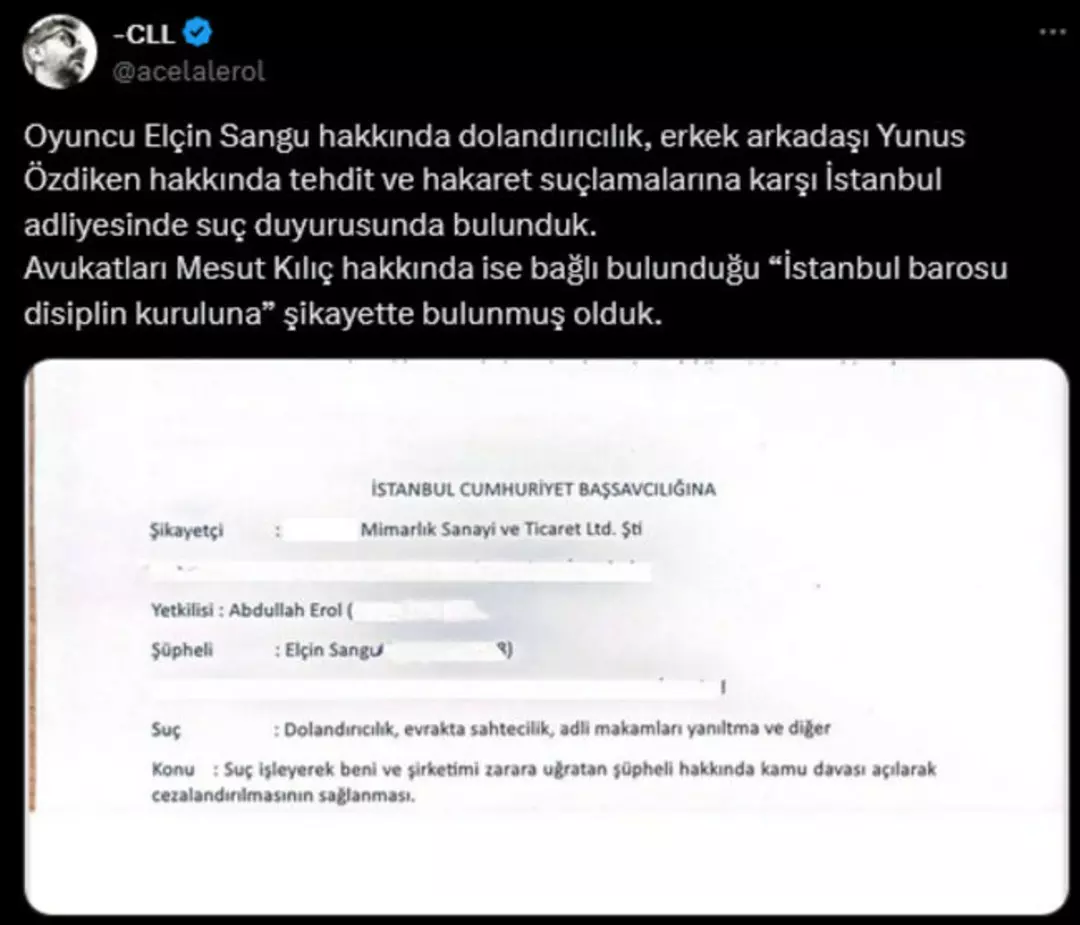 2022'de Elçin Sangu'ya alacak davası açan Abdullah Celal Erol, bu kez de ünlü oyuncu hakkında, 'dolandırıcılık', 'evrakta sahtecilik' ve 'adli makamları yanıltma' iddiasıyla dava açılması için İstanbul Cumhuriyet Başsavcılığı'na suç duyurusunda bulundu.