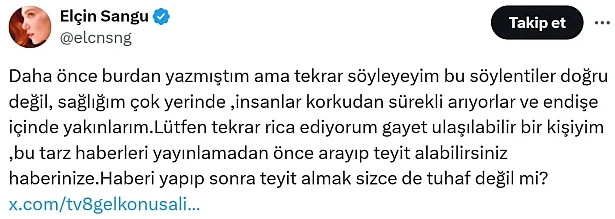 Sözcü Gazetesi'nin haberine göre bir süredir ekranlardan uzak olan Elçin Sangu'nun geçen haftalarda sağlık durumuyla ilgili sıkıntı yaşadığı iddia edilmişti.