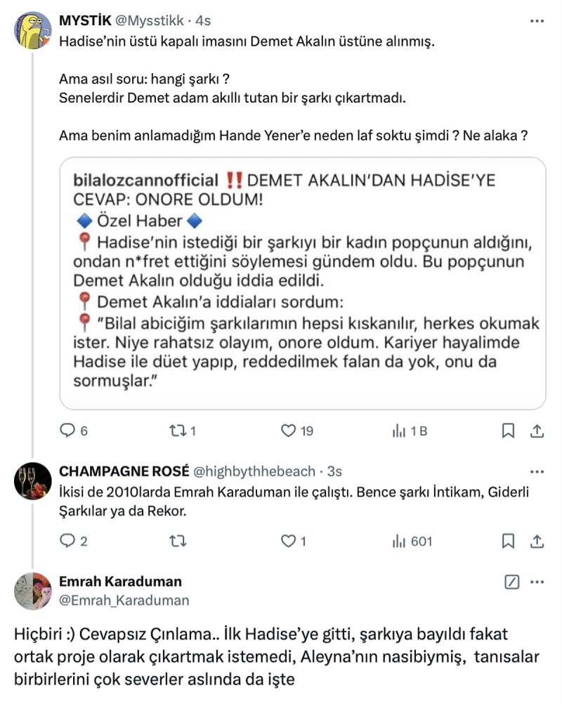 Demet Akalın olayı hemen üstüne alındı, Sinan Akçıl kendince onayladı, kızılca kıyamet koptu falan ama geçtiğimiz saatlerde Emrah Karaduman'dan olay bir ifşa geldi! Mevzubahis Demet Akalın'ın hangi şarkısı olabilir diye düşünen bir X kullanıcısına cevap veren Karaduman Hadise'nin bahsettiği asıl kişiyi duyurdu.