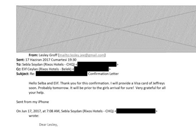 Dosyalar arasında yer alan yazışmalarda Jeffrey Epstein’in bazı mağdurları Antalya’ya Rixos Premium Belek Otel’e gönderdiği ifade ediliyor.