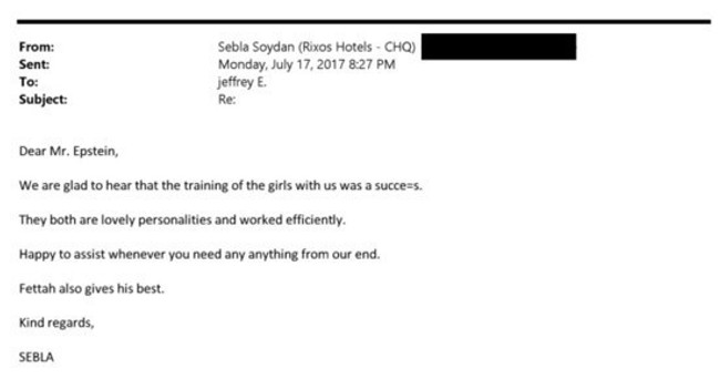 SuperHaber’in aktardığı habere göre, dosyalarda 7 Haziran 2017 tarihli bir e-posta’da Sebla Soydan’ın Rixos Hotels-CHQ gönderici ismiyle Jeffrey Epstein’e hitaben İngilizce olarak bir kadın çalışanın “masöz” olarak seviyesinin belirlenmesi konusundaki diyaloglar kayıtlara geçti.
