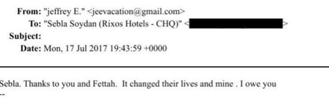 Öte yandan Epstein’in, Rixos Otelleri’nin patronu Fettah Tamince ve otel yöneticisi Sebla Soydan’a teşekkür maili gönderdiği ortaya çıktı.