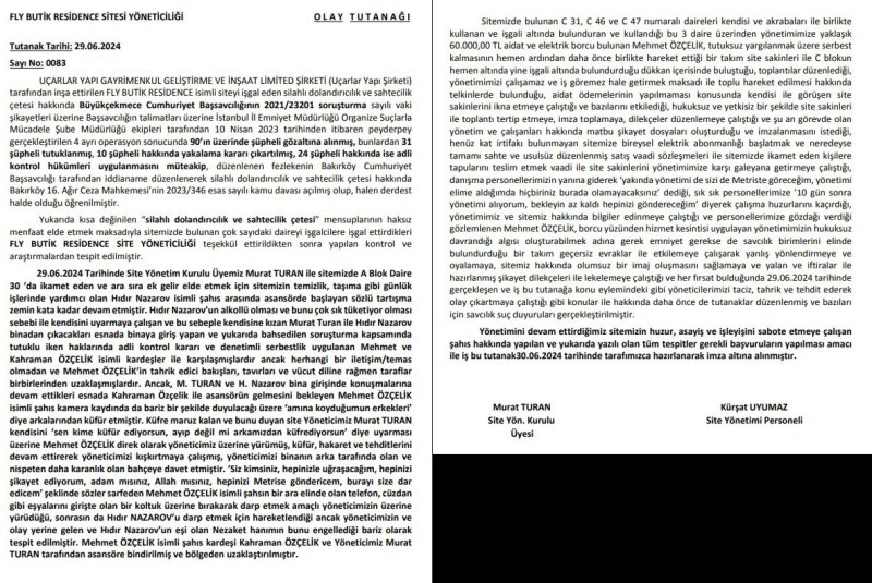 Site yöneticisi Metin Uçar, yaşananlarla ilgili olarak, ‘’Dosyanın örgüt yöneticilerinden olan şahıs baskı kurmak için yeniden sitemize geri döndü. İşgal ettiği bir dükkana sözde kafe açarak örgüt üyeleriyle burada toplantılar yapıyor. Sürekli olarak çalışanlarımıza psikolojik baskılar, tehditlerde bulunuyorlar. Bazı tartışmalarda ağza alınmayacak küfürler ediyorlar. Üstelik küfür ettikleri de kadınlar. Son olarak kafeteryanın bulunduğu bloğun bodrum katında bir pompalı silah bulundu. Dokunmadan polise teslim ettik. Yönetimi işlevsiz hale getirmek için site sakinlerine ‘Faturalarınızı, aidatlarınızı ödemeyin’ baskısı yapıyorlar. Hazırladığımız tutanaklar, site kameralarına yansıyan bazı videoları bir şikayet dilekçesiyle savcılığa sunduk. Adalete de devletimize güvenmekten başka elimizden birşey gelmiyor’ diye konuştu.