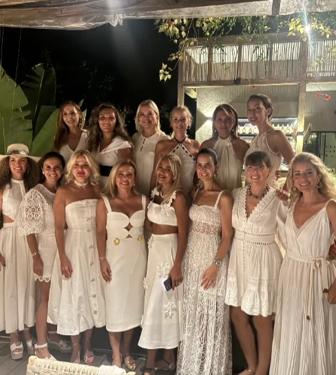 Beyaz elbise giyen sosyetik arkadaş grubu, her birlikte pasta üfleyip kutlama yaptı.