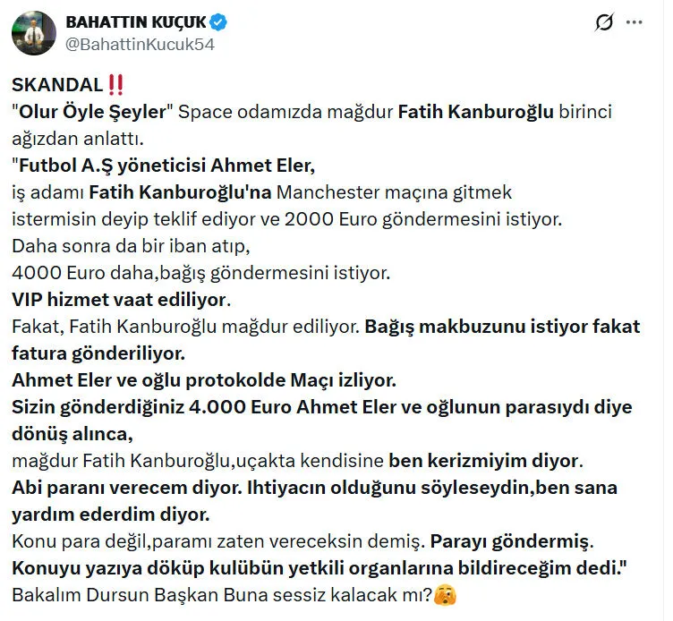Olaya ilişkin X hesabından paylaşım yapan eski Sakaryaspor yöneticisi ve Galatasaray taraftarı Bahattin Küçük şunları yazdı: