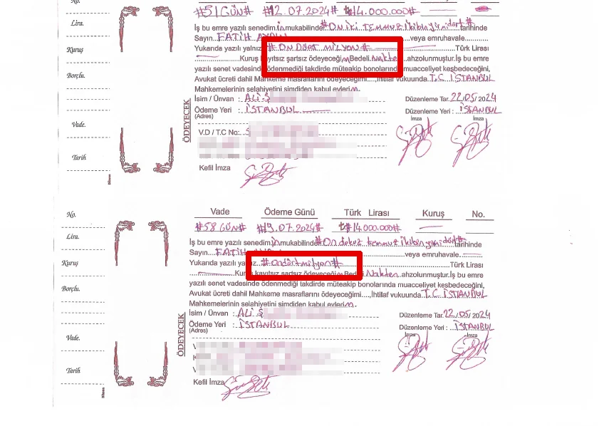 Ali Ş. Z., borcuna karşılık Aydın’a 28 milyon lira değerinde iki senet verdi. Her biri 14’er milyon TL olan iki senedin ödeme tarihleri ise 12 Temmuz ve 19 Temmuz 2024 olarak belirlendi. Ancak senetler ödenmedi. Bu aşamadan sonra Aydın, senetleri icraya koydu.