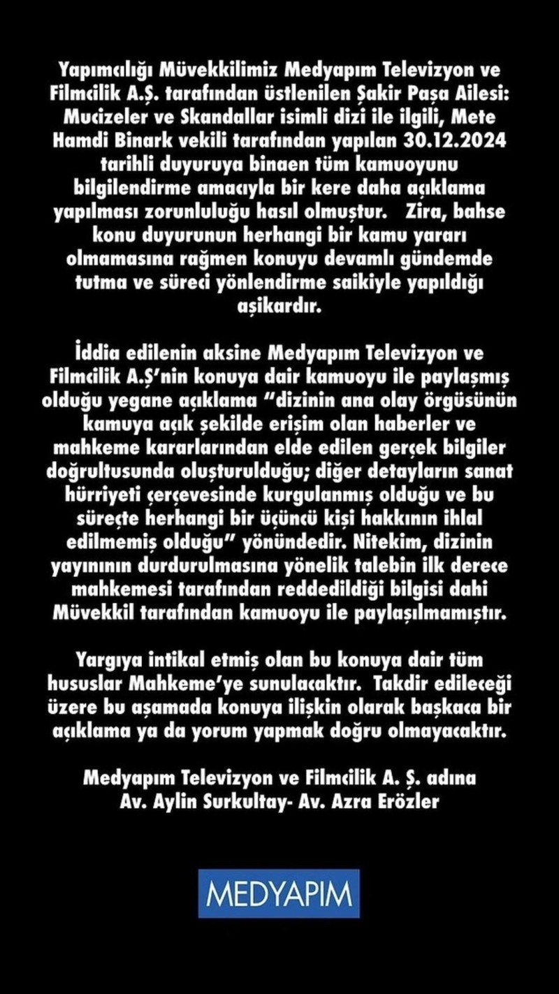 Yapım şirketi ise yaptığı açıklamada dizinin yayınının durdurulmasına yönelik talebin ilk derece mahkemesi tarafından reddedildiğini yaptığı duyuruyla başka bir açıklama ya da yorum yapılmayacağını belirtti.