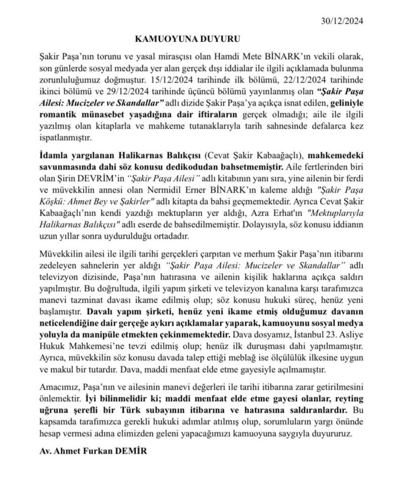 Yapılan açıklamada Şakir Paşa'nın geliniyle ilişki yaşadığına dair iddiaların iftira olduğu belirtildi.