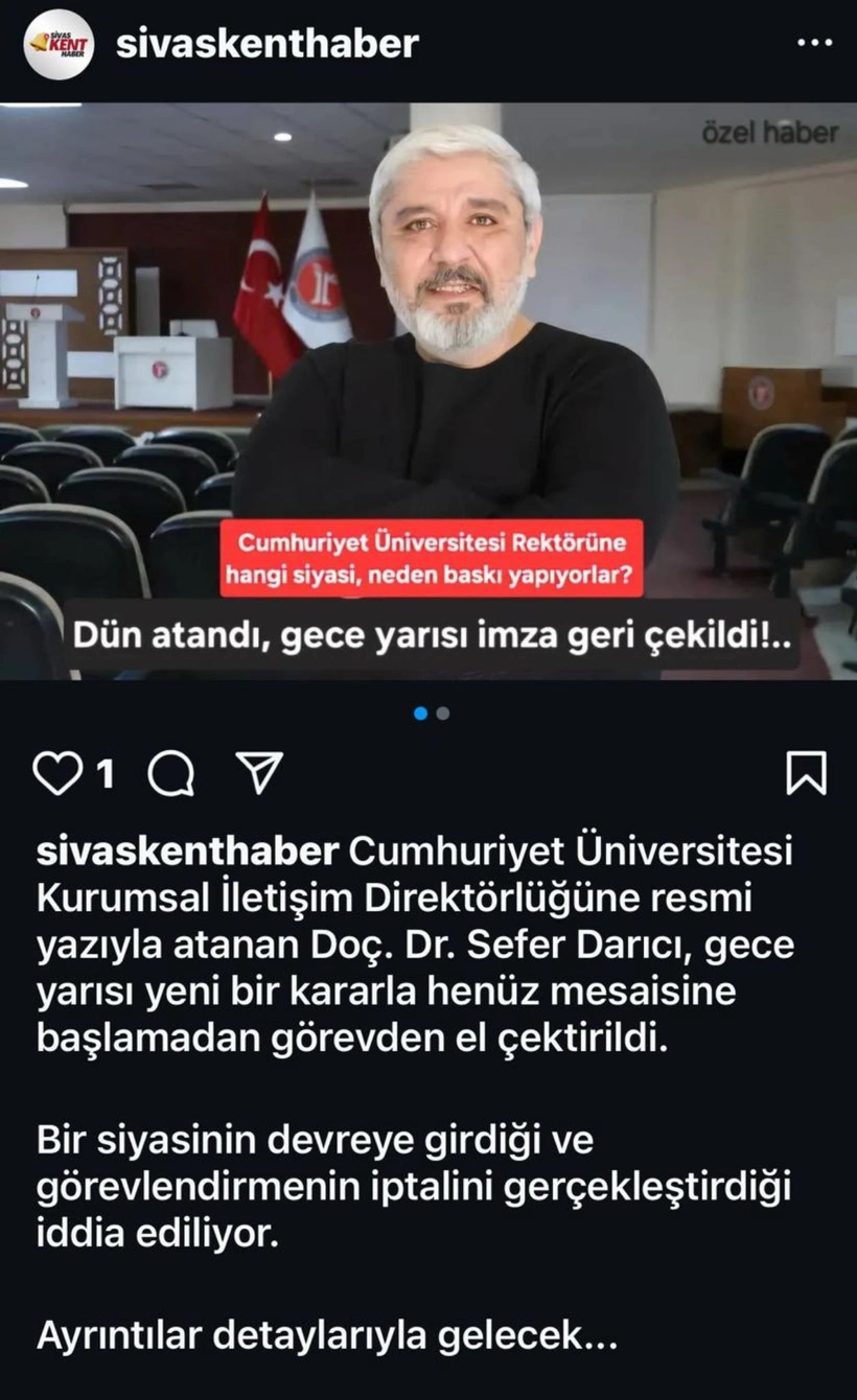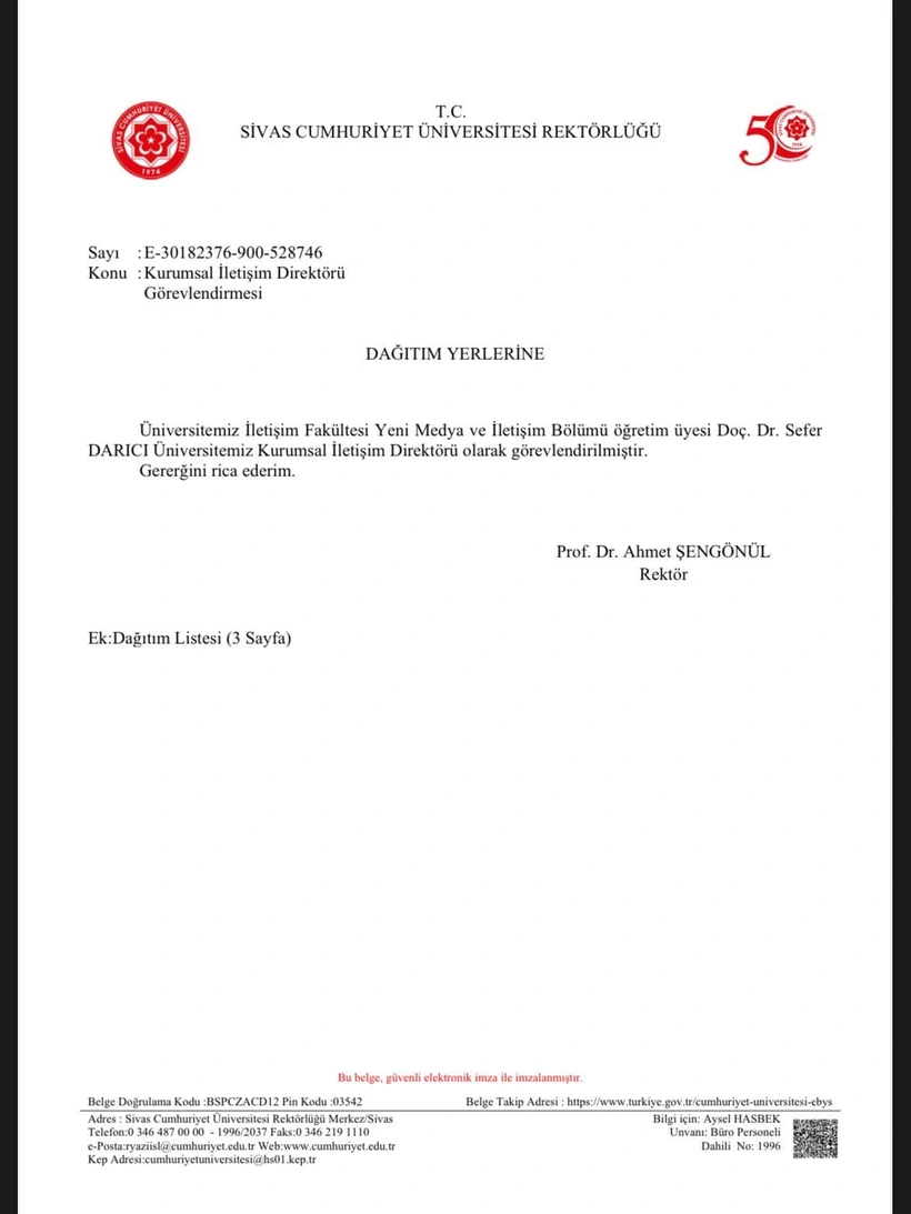 Sivas Cumhuriyet Üniversitesi Rektörü Prof. Dr. Ahmet Şengönül, 14 Şubat 2025 tarihinde ‘’Kurumsal İletişim Direktörlüğü Görevlendirilmesi’’ başlığıyla bir görevlendirme kararına imza attı. Prof. Şengönül tarafından imzalanan görevlendirme yazısı şöyle; ‘’Üniversitemiz İletişim Fakültesi Yeni Medya ve İletişim Bölümü öğretim üyesi Doç. Dr. Sefer Darıcı üniversitemiz Kurumsal İletişim Direktörü olarak görevlendirilmiştir. Gereğini rica ederim’’ Prof. Şengönül, 14 Şubat 2025’te imzaladığı görevlendirme yazısını aynı gece geri çekti.