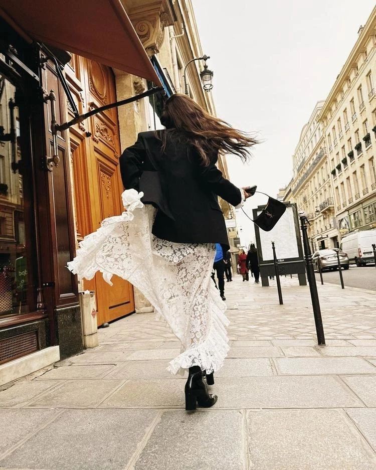 Bir çekim için kamera karşısına geçen Afra Saraçoğlu, siyah iç çamaşırlarının üstüne beyaz dantel detaylı uzun bir hırka ile siyah bot ve ceket tercih etti.