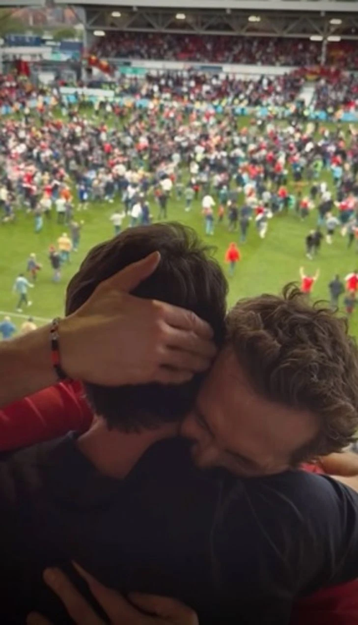 Maç sonrası boşalan statta kalmaya devam ederek galibiyeti kutlayan çift, birbirlerine sarılarak mutluluklarını sergiledi.